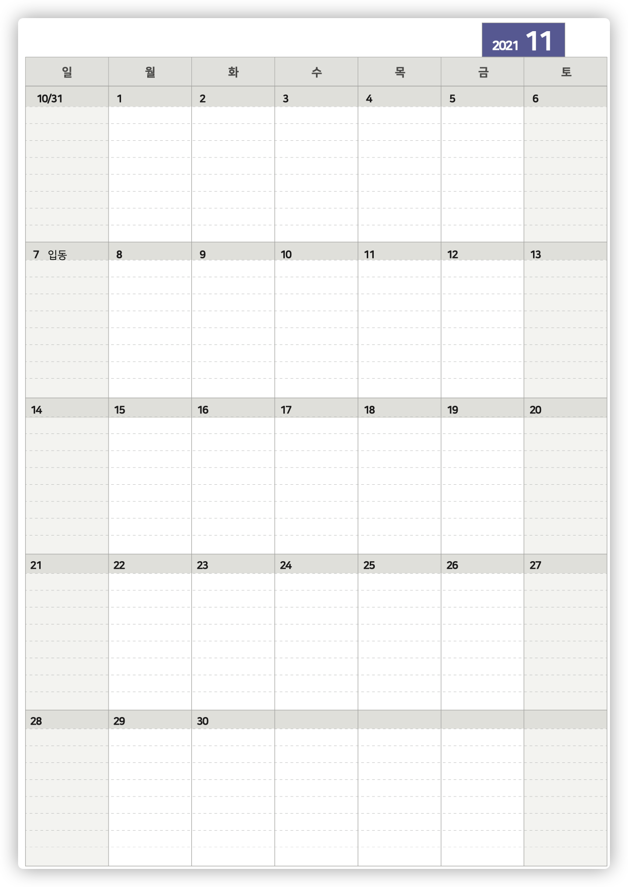 # 2021년 11월 달력 (세로)